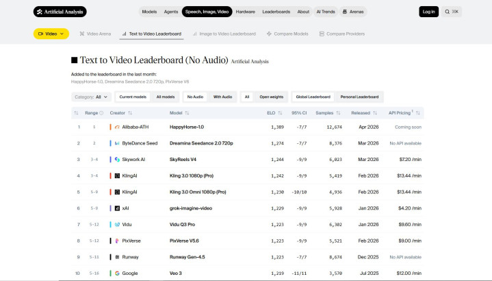 莫得任何官方背书、莫得任何公司认领的巧妙模子,悄然空降AI视频领域最巨擘的第三方评测榜单Artificial Analysis Video Arena,以1333 Elo分的获利登顶视频竞技场名次榜,在文本生成视频(含音频/不含音频)、图片生成视频(含音频/不含音频)四个赛说念中均位列第一。