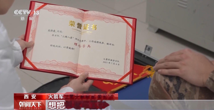 火箭军工程大学学员安烽豪:这是我这段时辰一些汗水的证据。这个荣誉文凭是我那时在进入任务时,阶段性的评选赏赐。想把荣誉带回家,跟家东谈主共享一下这份欢腾。这个是雠校时受阅服上指挥的80周年艳丽徽。这是咱们火箭军方队的相片。