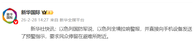 新华社快讯:以色各国防军说,以色列全境拉响警报,