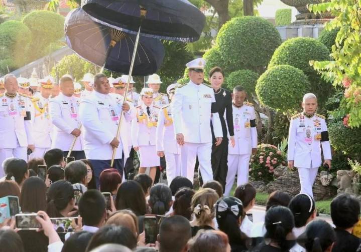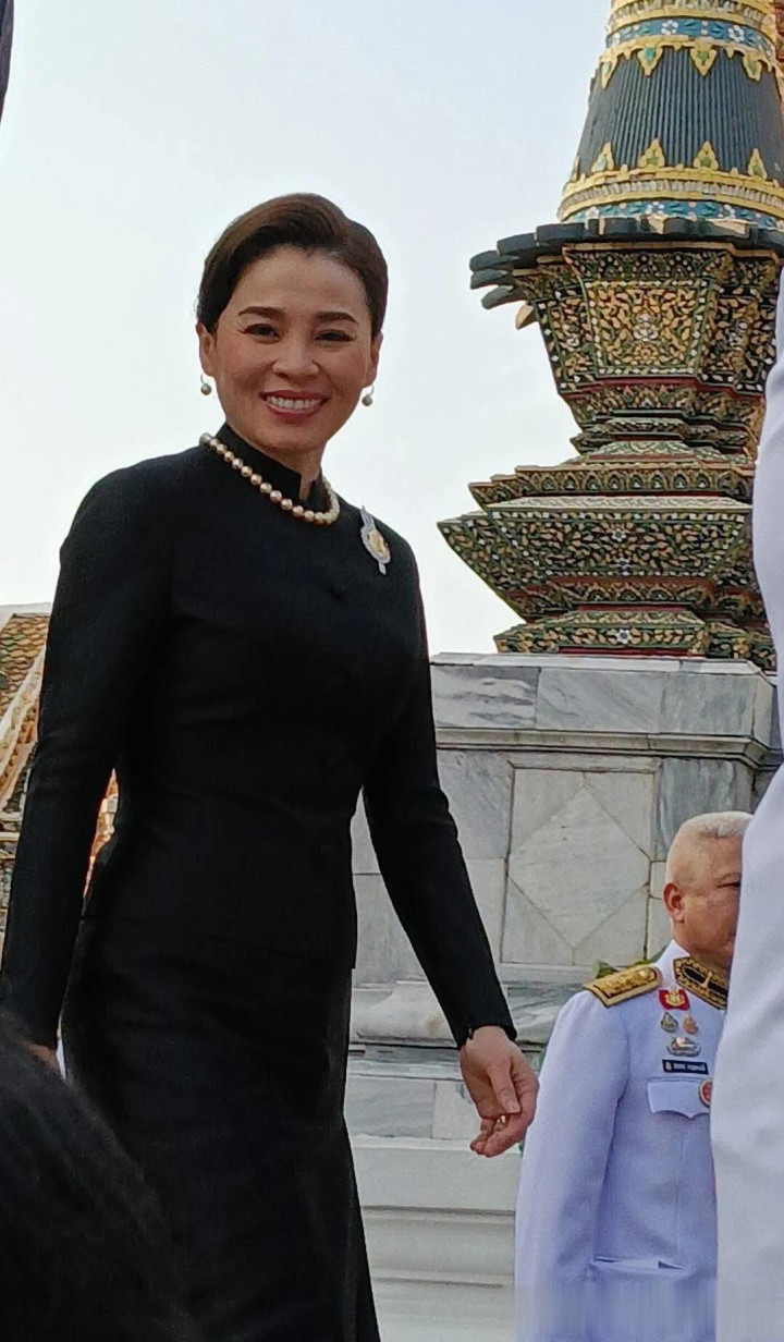 因为如今依旧还在已故诗丽吉王太后的吊问期,因此玛哈国王依旧戴着玄色孝袖,而苏提达王后也相通是孤苦玄色丧服。