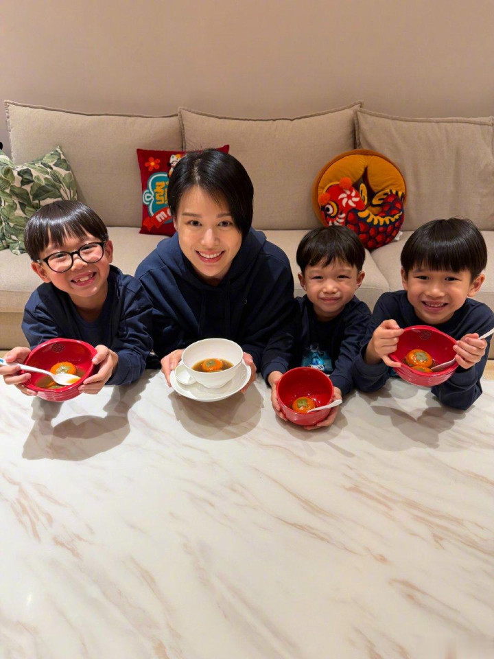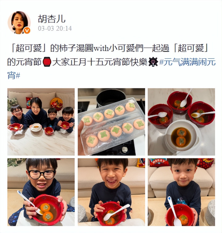 在2月3日元宵节今日,胡杏儿晒出一家东谈主过节的画面,元宵节诚然是要吃元宵了,胡杏儿还有益选了事事如意的元宵天下全部吃,子母三东谈主排排坐在沙发前边吃看起来相当温馨了,尤其是子母三东谈主还穿上了同款深蓝色卫衣看起来齐好像啊!