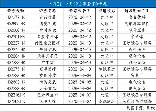 据Wind数据,4月6日-4月12日有12家公司向港交所递表,另有2家公司通过聆讯,3家公司招股。