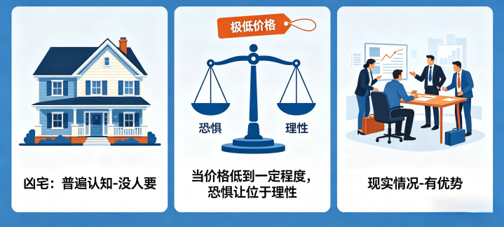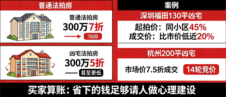 凶宅在法拍商场的最大卖点,便是扣头。一套商场价300万的屋子,平庸法拍房可能7折起拍,而凶宅经常径直打到5折甚而更低。