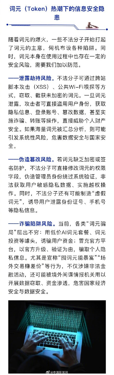 跟着词元的爆火,一些犯法分子启动打起了词元的看法,乘机布设多样陷坑。同期,词元自己在使用历程中也存在一定的安全风险,需要咱们加以驻守。刻下,各类“词元骗局”论千论万:用廉价AI词元套餐、词元投资等噱头,易游app拐骗用户资金;冒充官方平台,以官方升级、考据为由,运用个东说念主秘密信息。尤其是声称“囤词元能暴富”“场酬酢易赚差价”等看成,不仅涉嫌罪人金融行径,还可能被境外间谍谍报机关用以开展数据窃取、资金渗入,危害国度经济安全与数据安全。(国度安一齐)