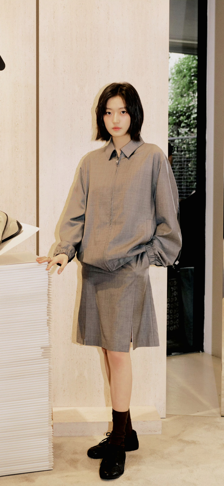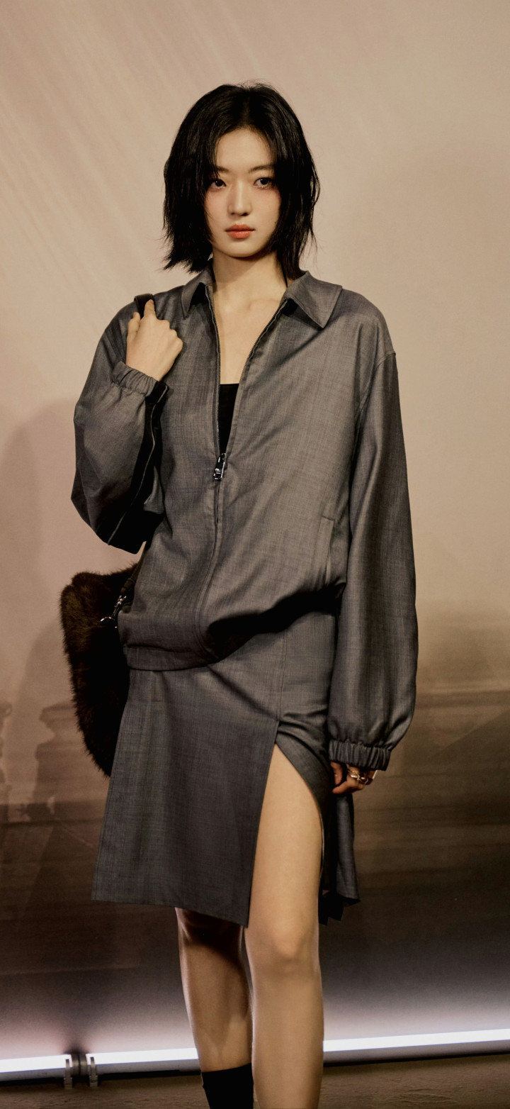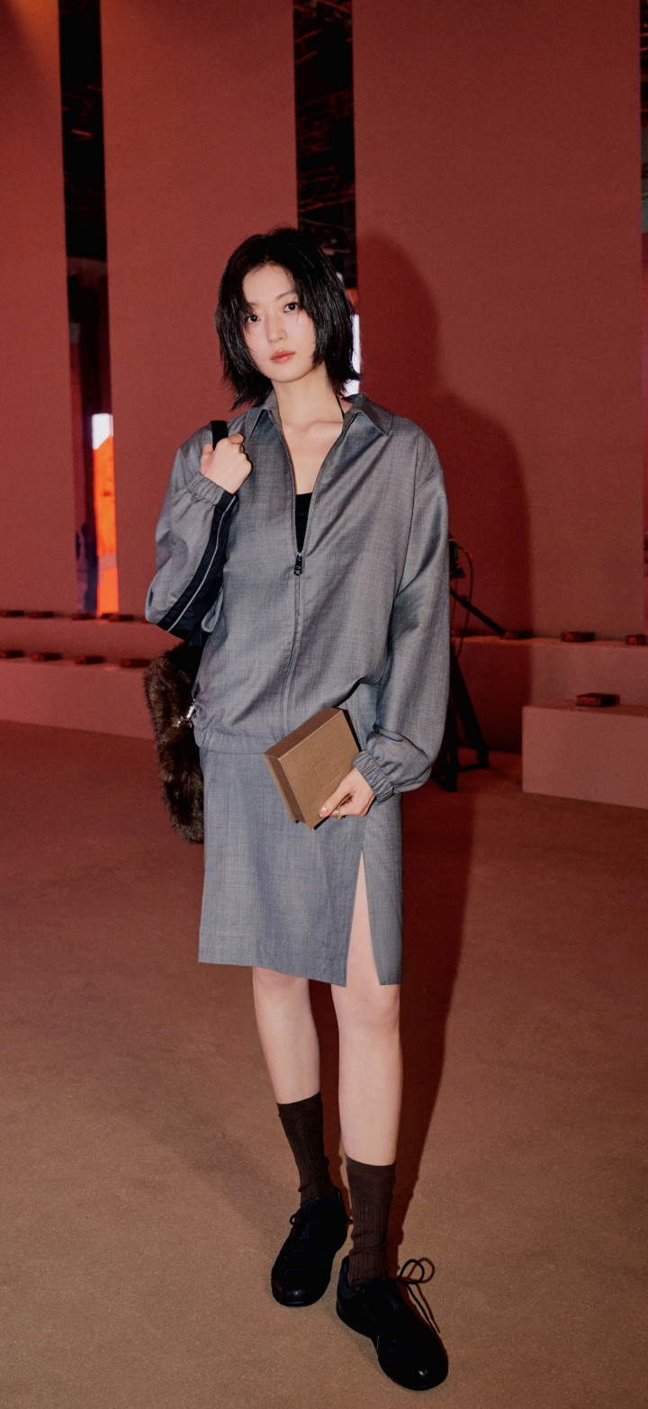 孙千大长腿好意思图,孙千身着定制深灰套装,